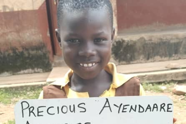 Hello, My name is Precious Ayendaare. My birthday is January 02, 2016. I live in the village of Vea, Ghana, where I attend school.
